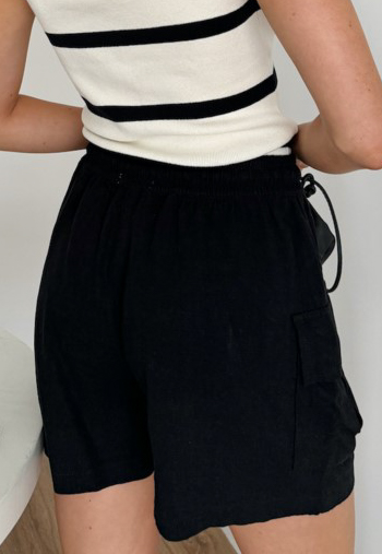 Short tipo cargo, confeccionado en viscosa con lino. Con cintura elástica y cordón para regular y bolsillos cargo en los laterales.