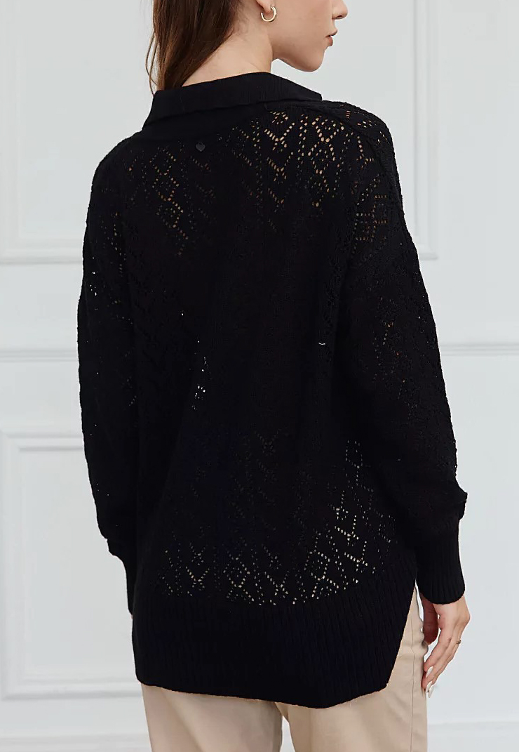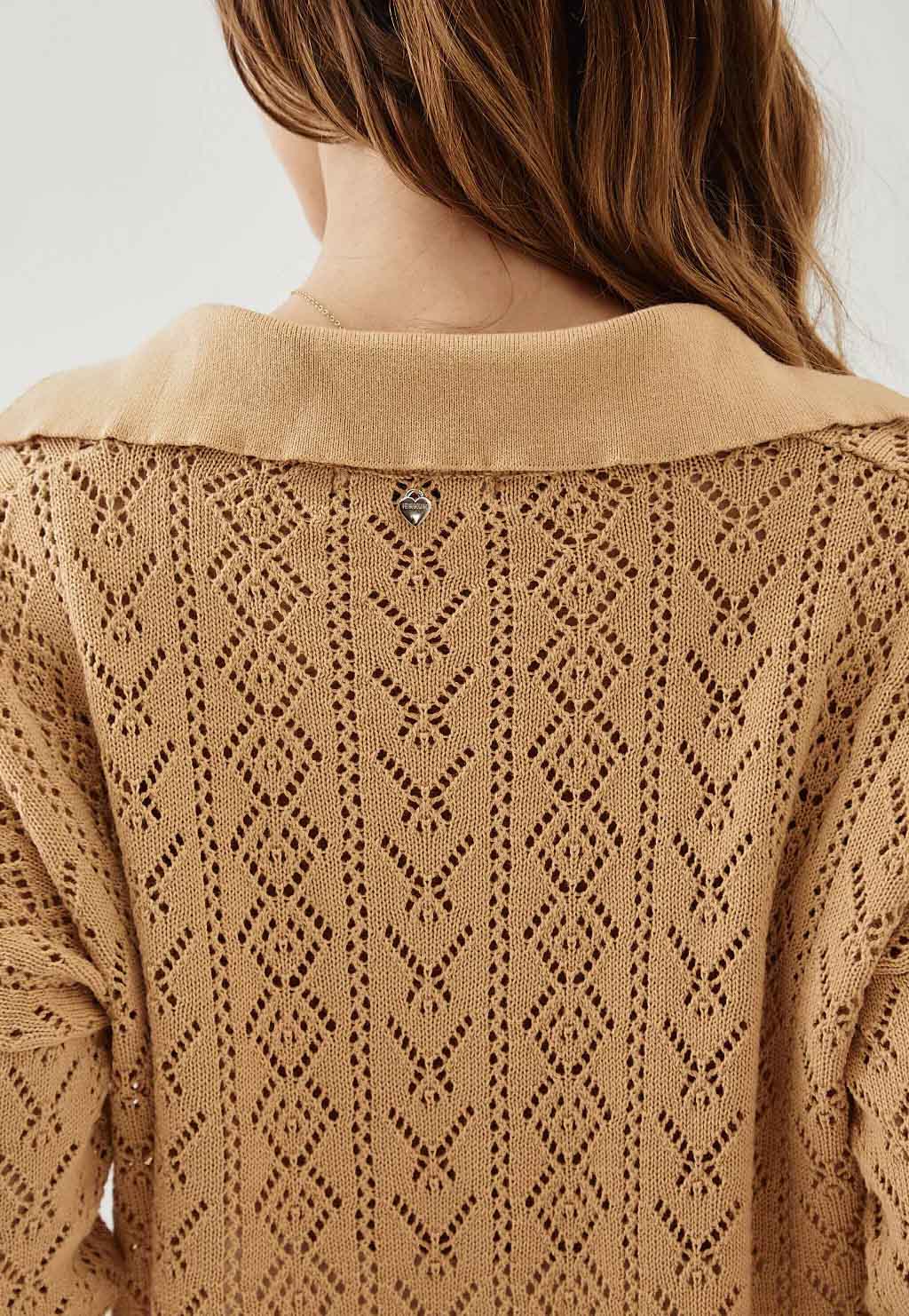Sweater calado, escote V, cuello polo, desnivel en espalda con tajo.