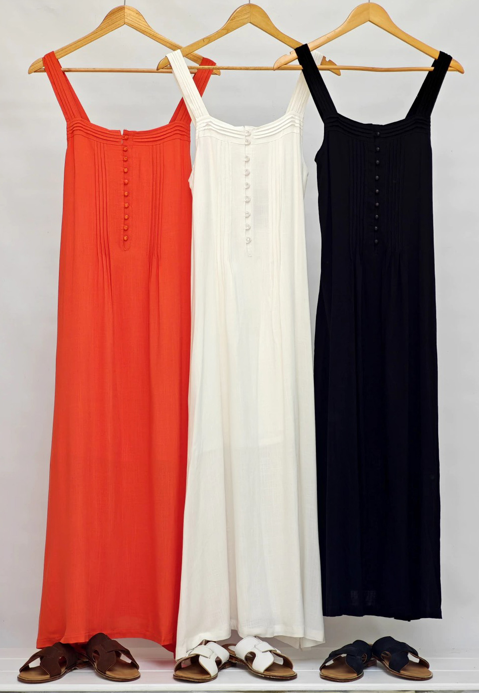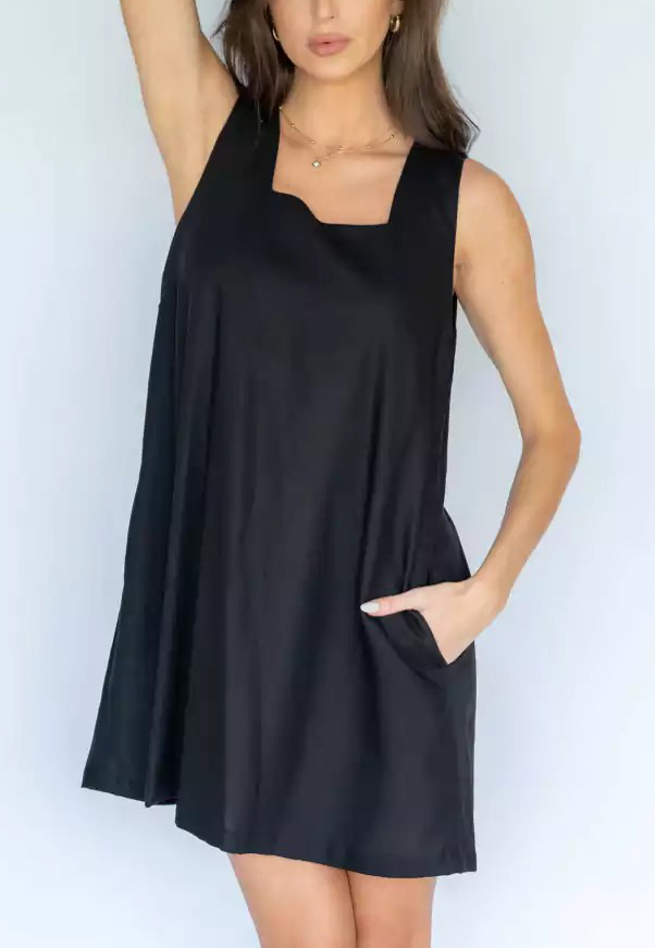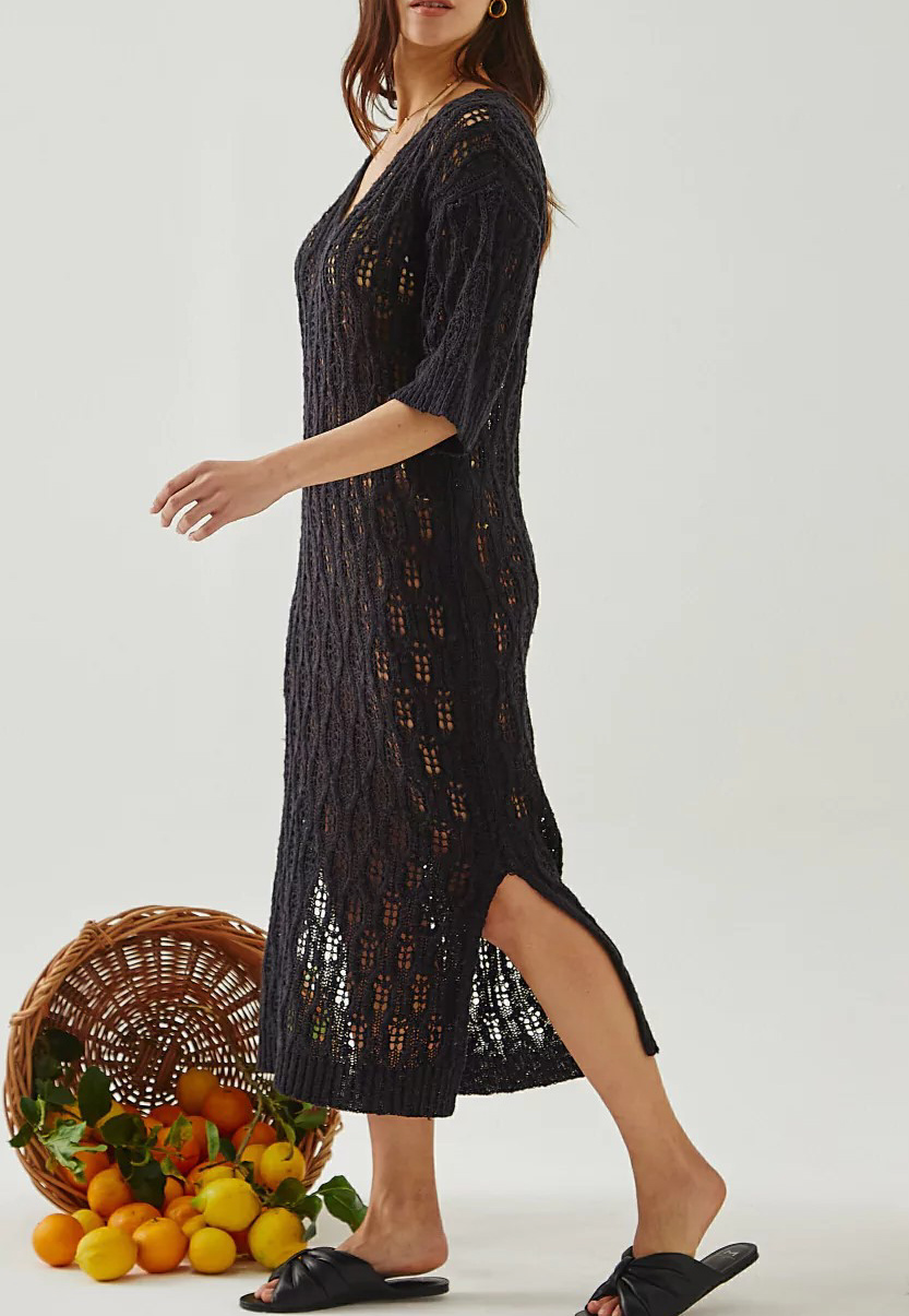 Vestido largo de lino escote en V, con costura y tajo frontal dandole su toque, único ademas posee con bolsillos